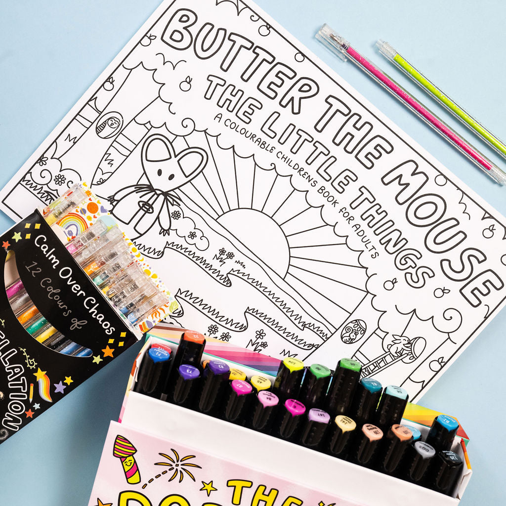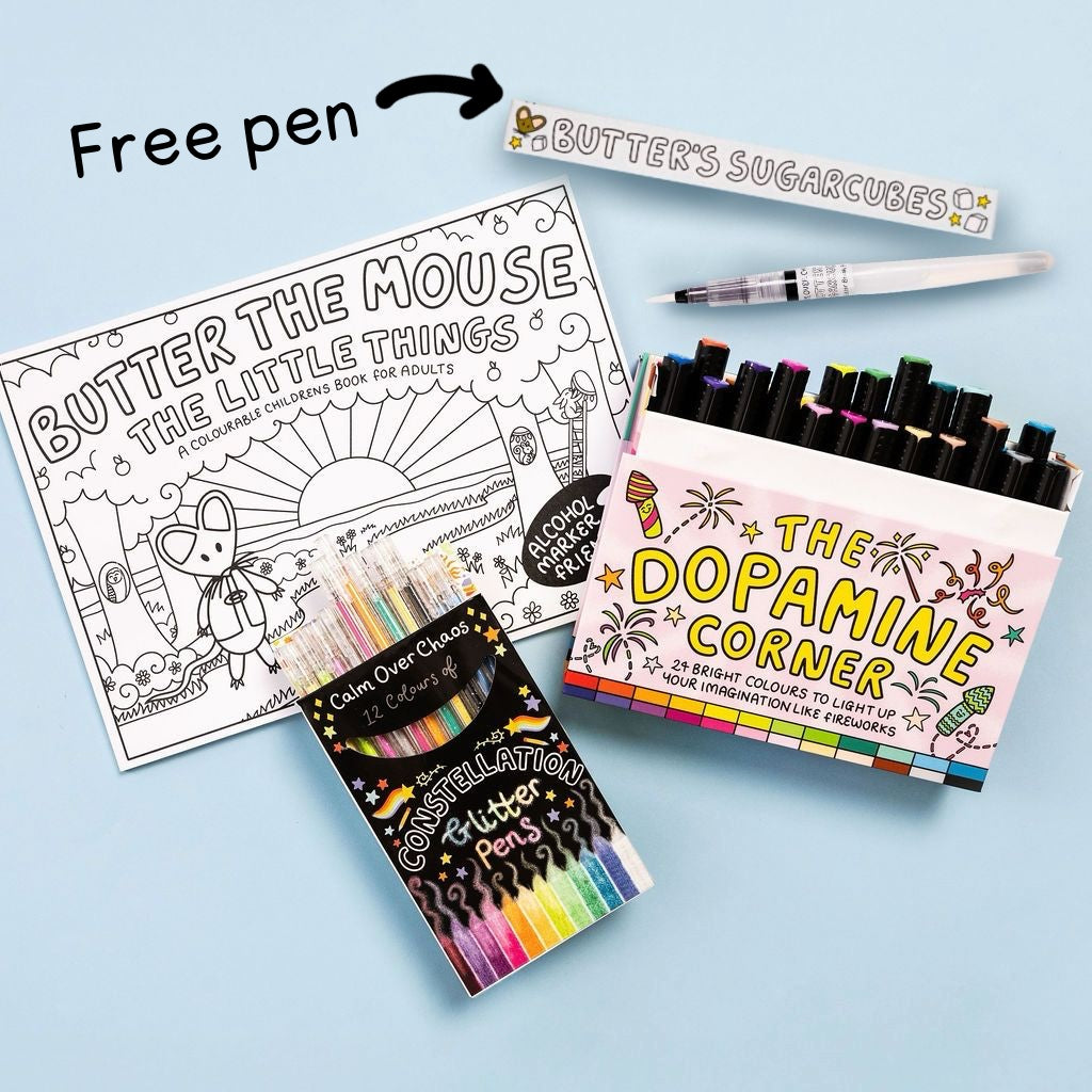 Butter’s Creative Escape Bundle brings together bold, blendable marker colour, gentle storytelling, and just the right amount of glitter. It’s designed for slow afternoons, cosy evenings, and those moments when you want to switch off from everything except what’s in front of you.