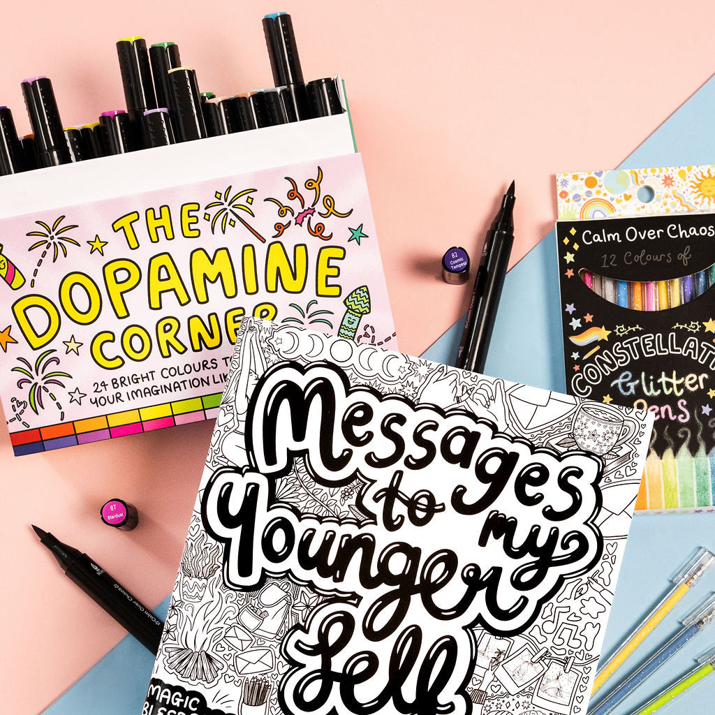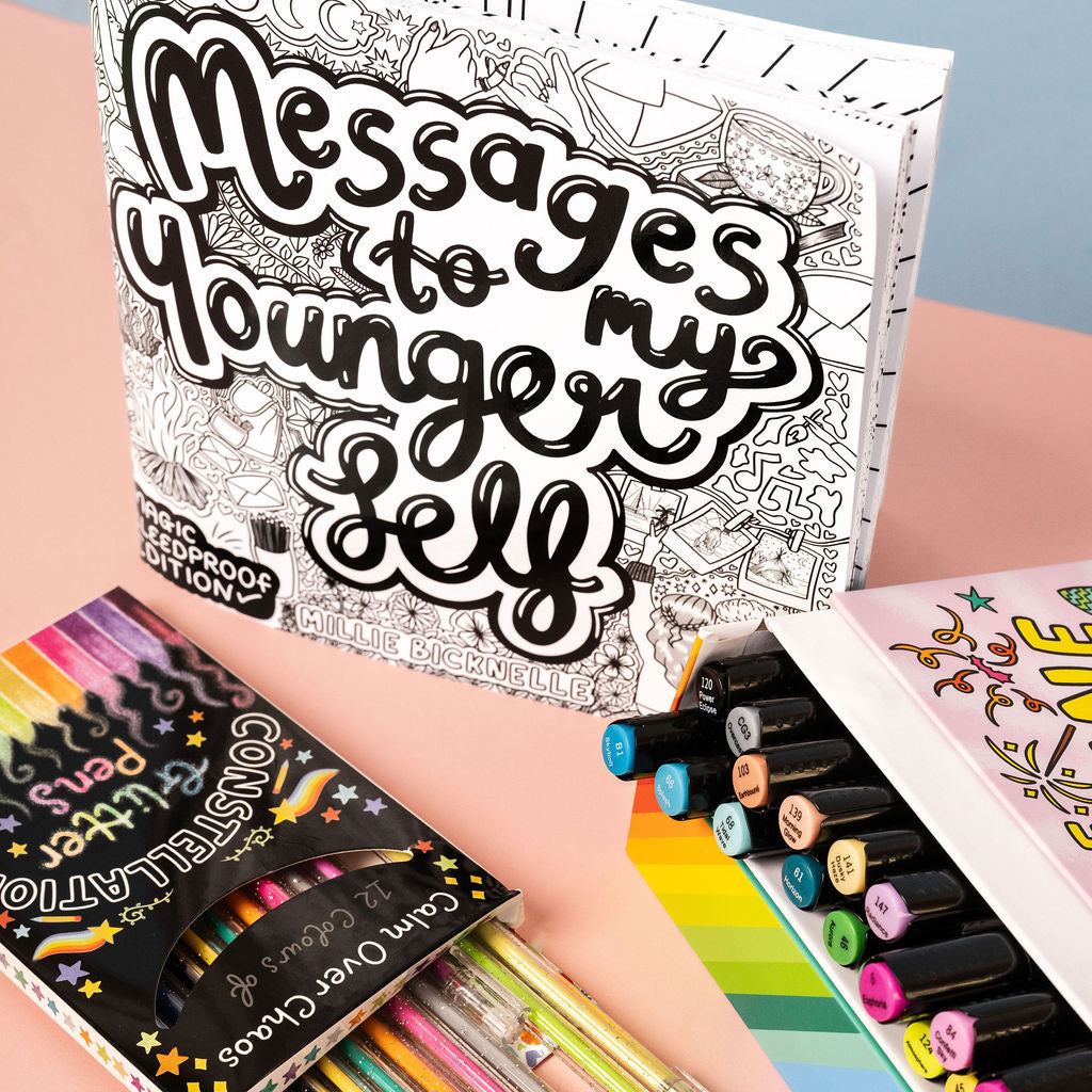 Messages To My Younger Self – coined 'the therapy book' by our customers, this is filled with thoughtful pages designed to help you reflect, process, and colour at your own pace. Printed on our bleedproof paper for zero bleed through with your new markers.